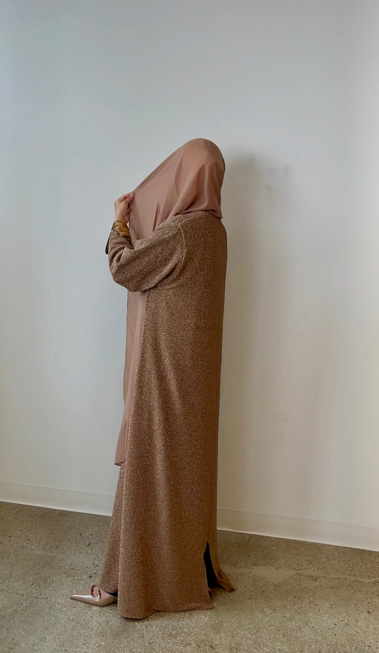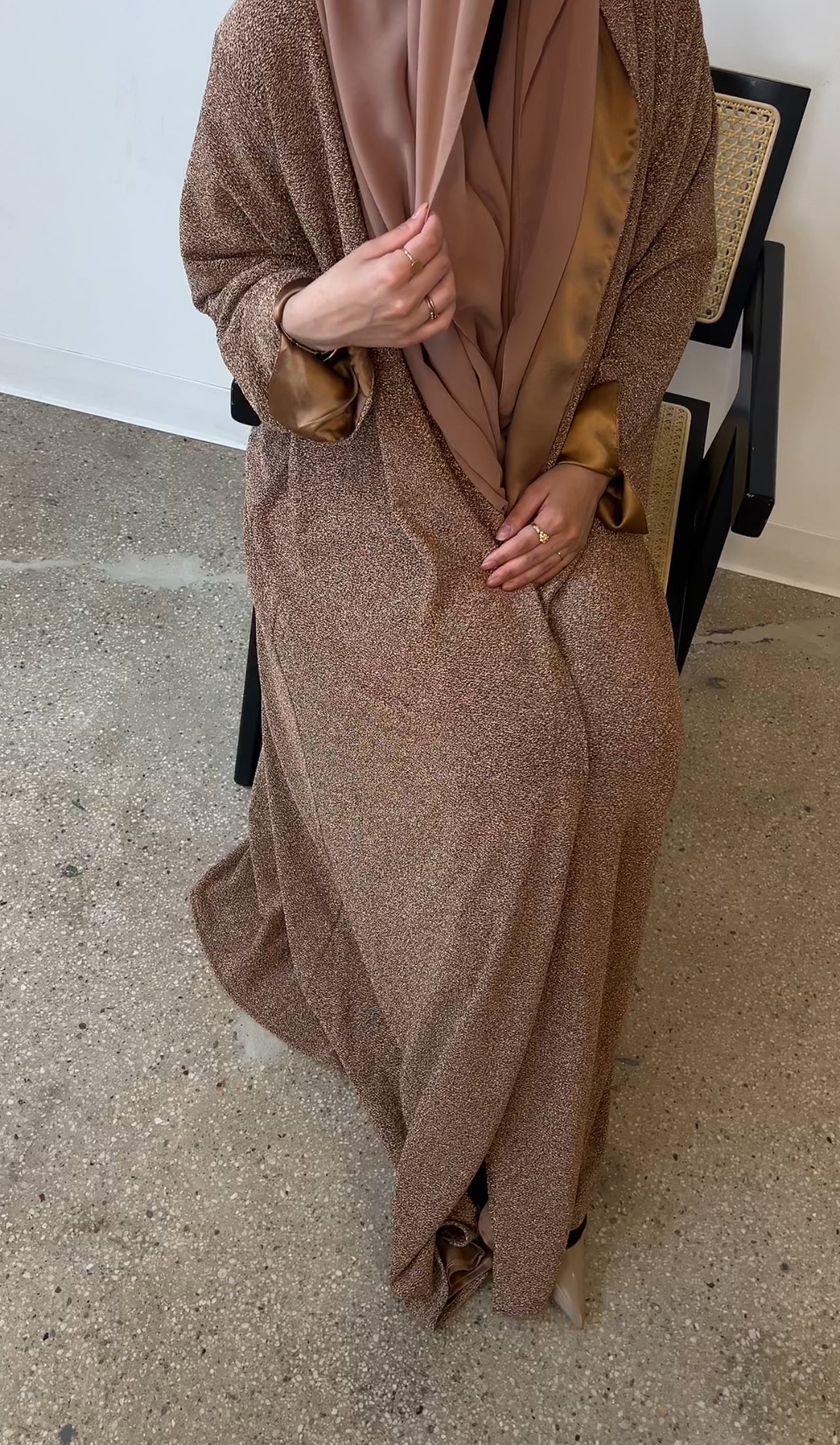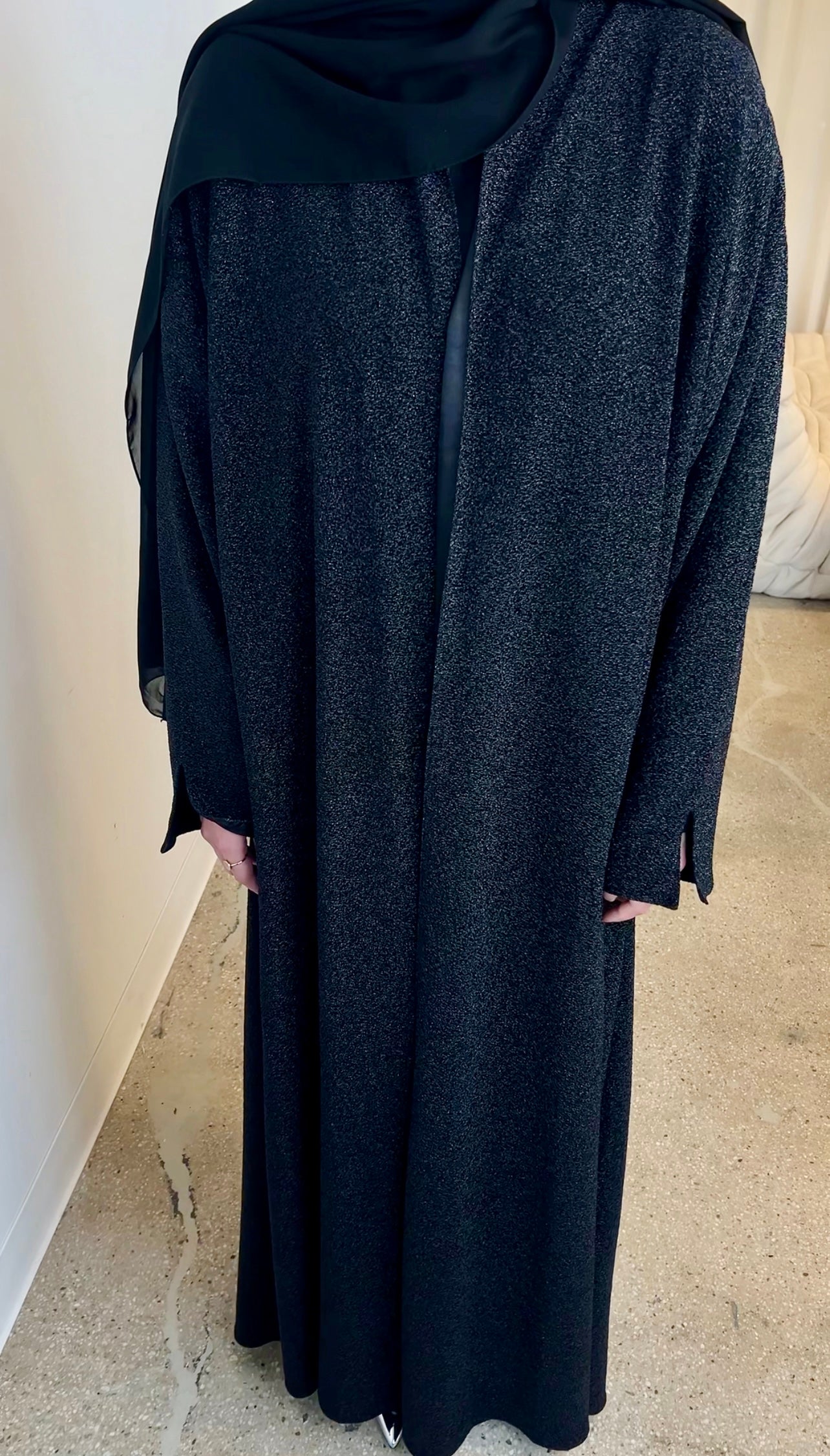 Open Abaya crafted from metallic nylon and lined with pure silk, this luxurious piece offers a radiant shimmer with an irresistibly soft feel. Designed for versatility, it can be worn reversibly, allowing you to switch up your look effortlessly. The flowy silhouette, paired with a chic slit at the back, adds an extra touch of elegance. A true showstopper, perfect for making a statement on any occasion.