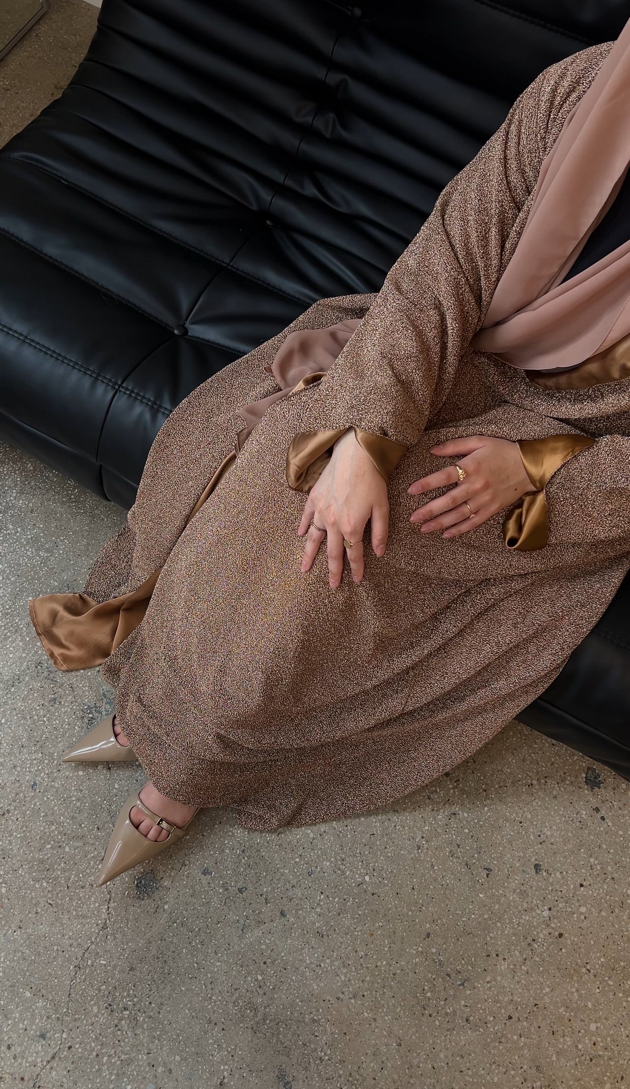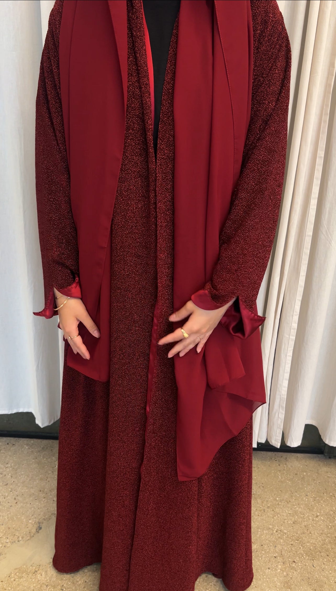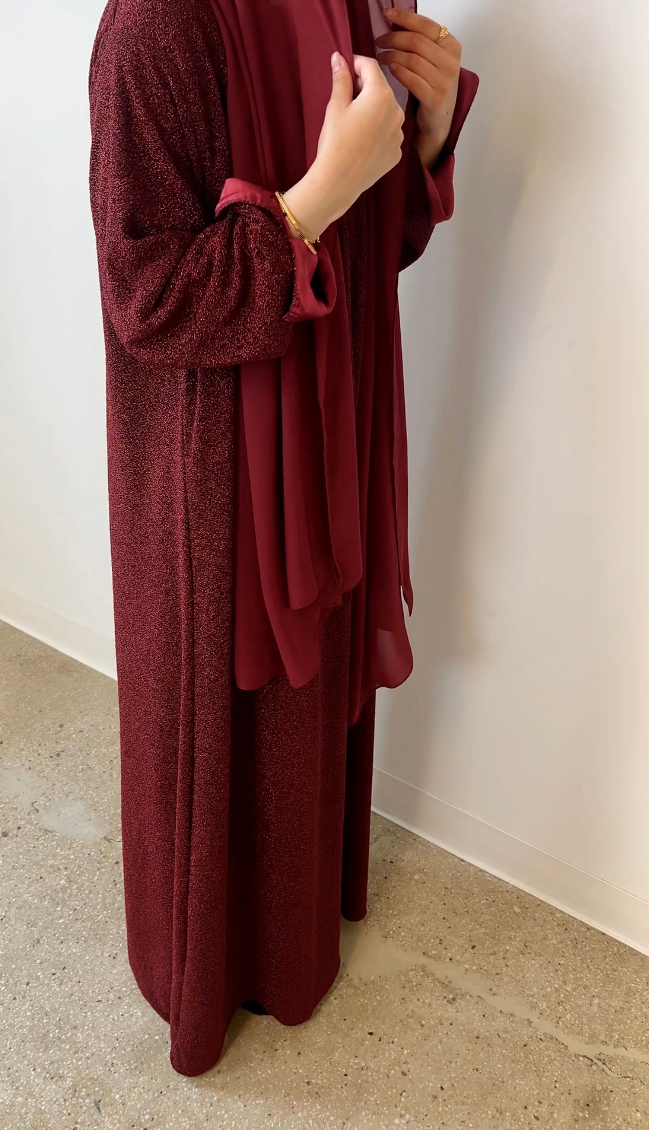 Open Abaya crafted from metallic nylon and lined with pure silk, this luxurious piece offers a radiant shimmer with an irresistibly soft feel. Designed for versatility, it can be worn reversibly, allowing you to switch up your look effortlessly. The flowy silhouette, paired with a chic slit at the back, adds an extra touch of elegance. A true showstopper, perfect for making a statement on any occasion.