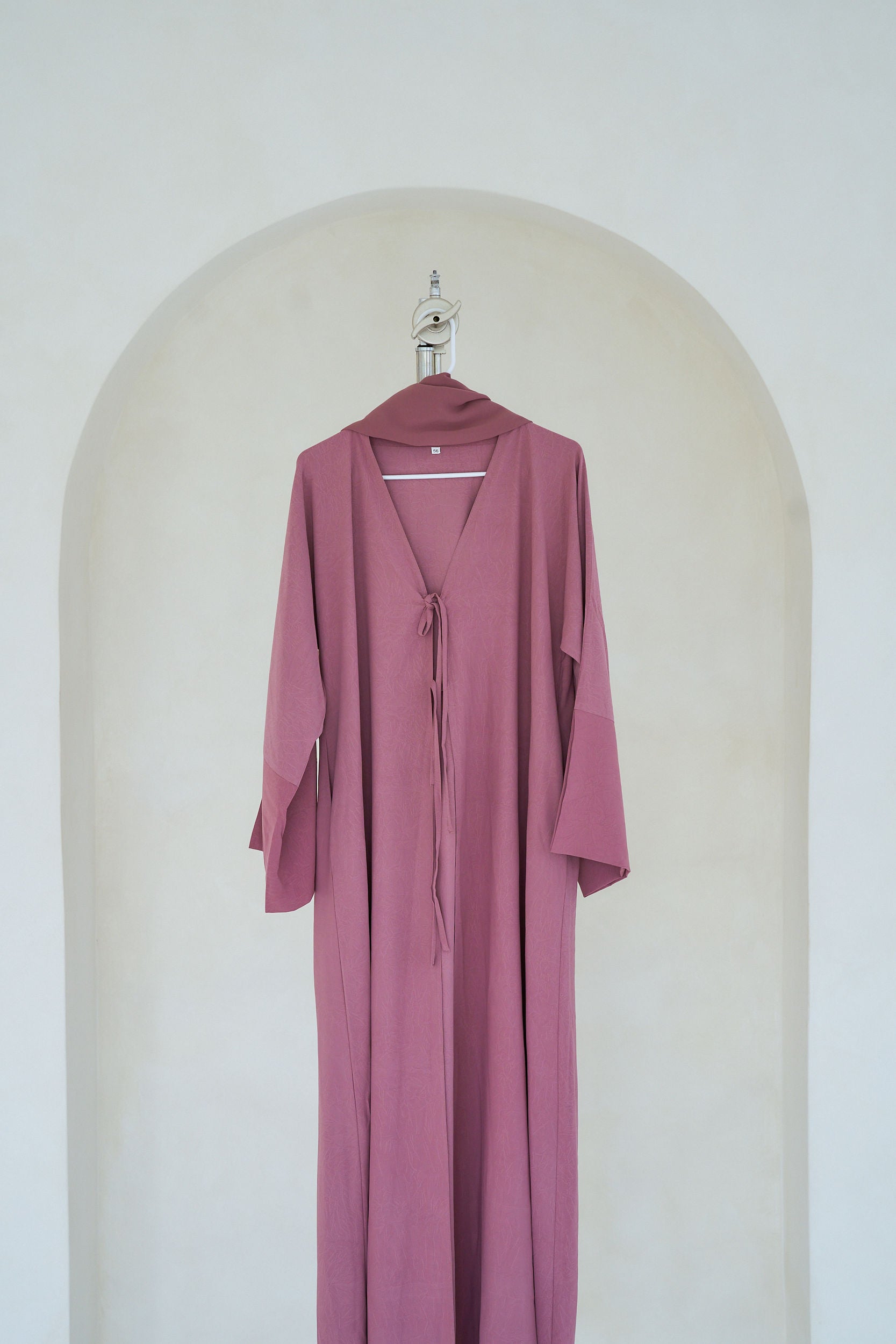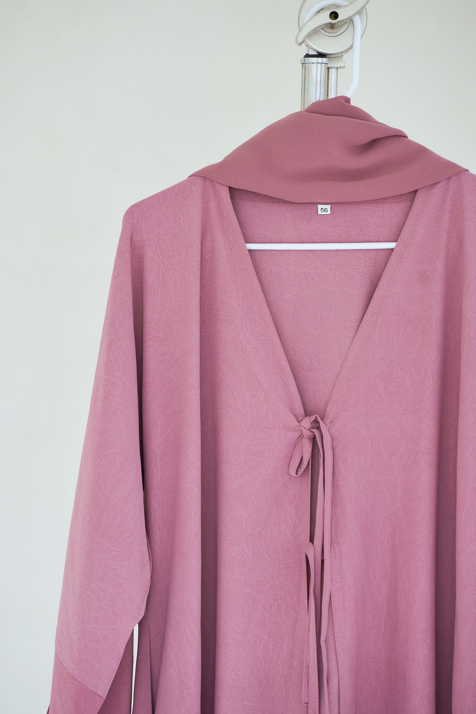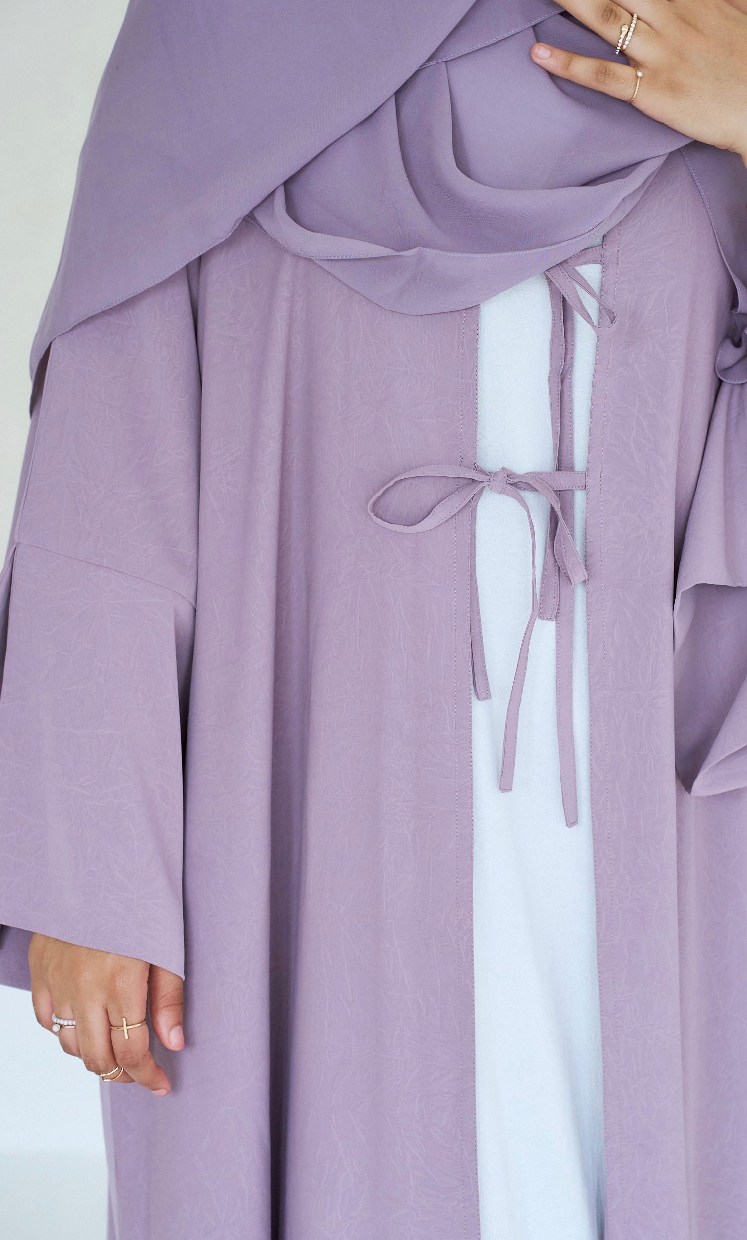 THE DARLING ABAYA features two stylish strings in front, aligning with this season's trends. The fabric boasts subtle summery detailing, adding a touch of elegance. A slit design on the wrist enhances its chic look. This abaya comes with a matching hijab and includes convenient pockets.