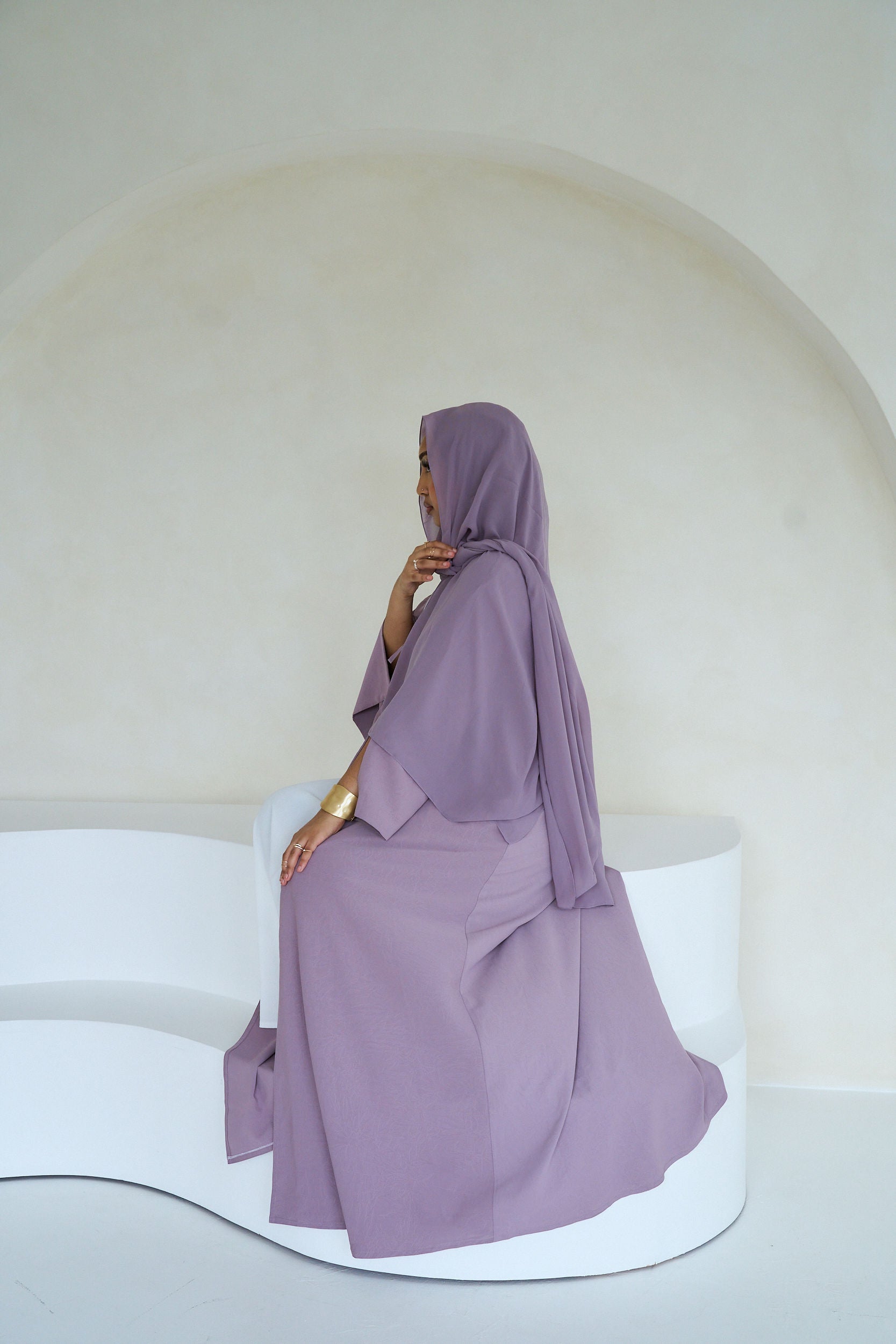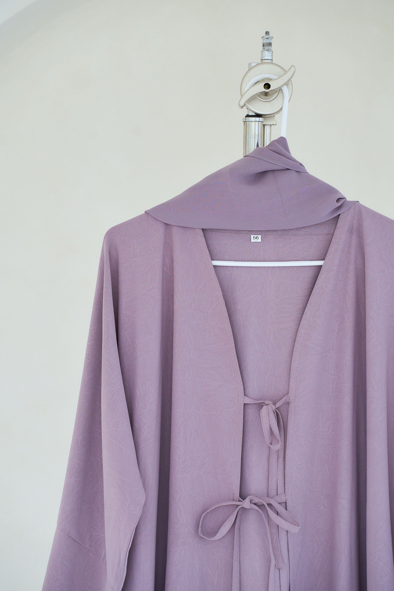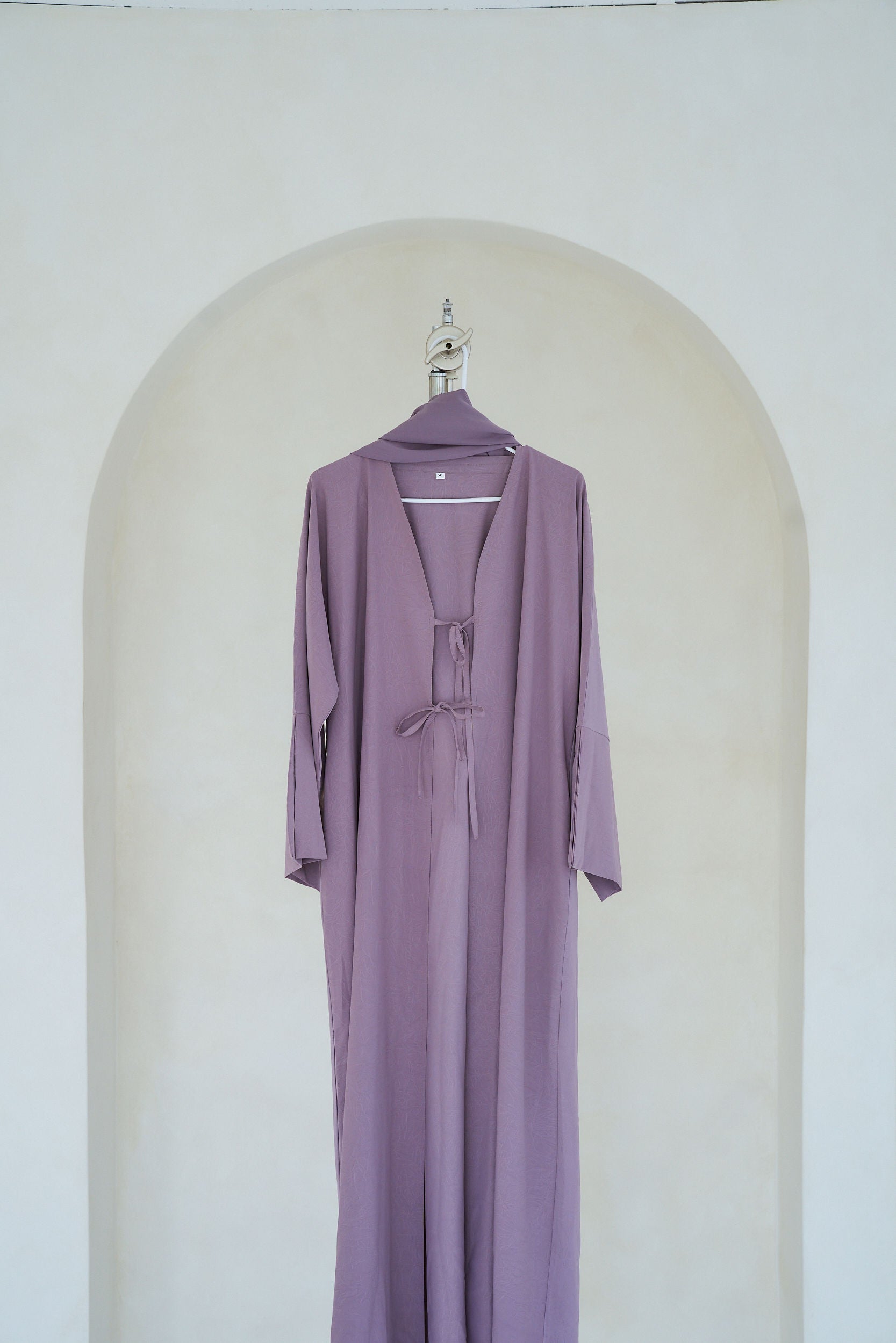THE DARLING ABAYA features two stylish strings in front, aligning with this season's trends. The fabric boasts subtle summery detailing, adding a touch of elegance. A slit design on the wrist enhances its chic look. This abaya comes with a matching hijab and includes convenient pockets.