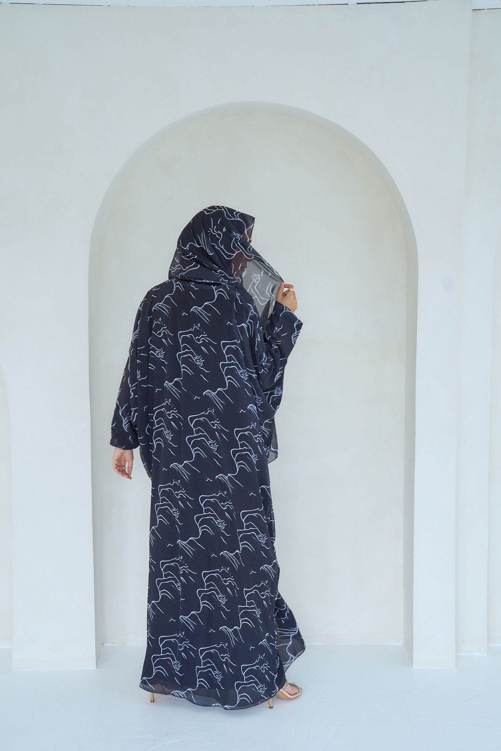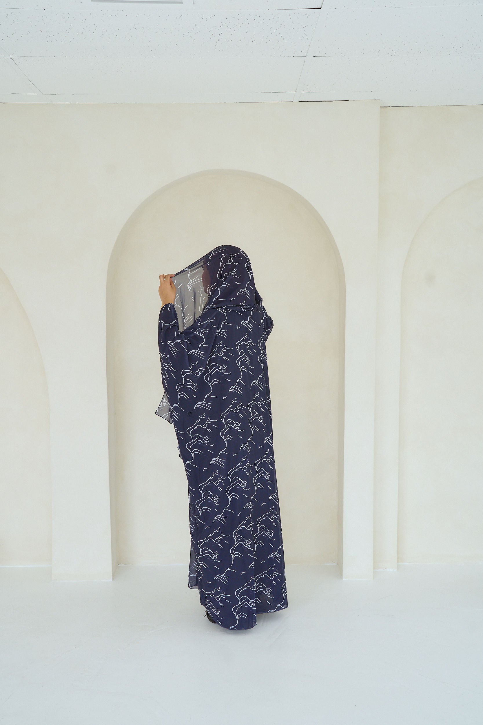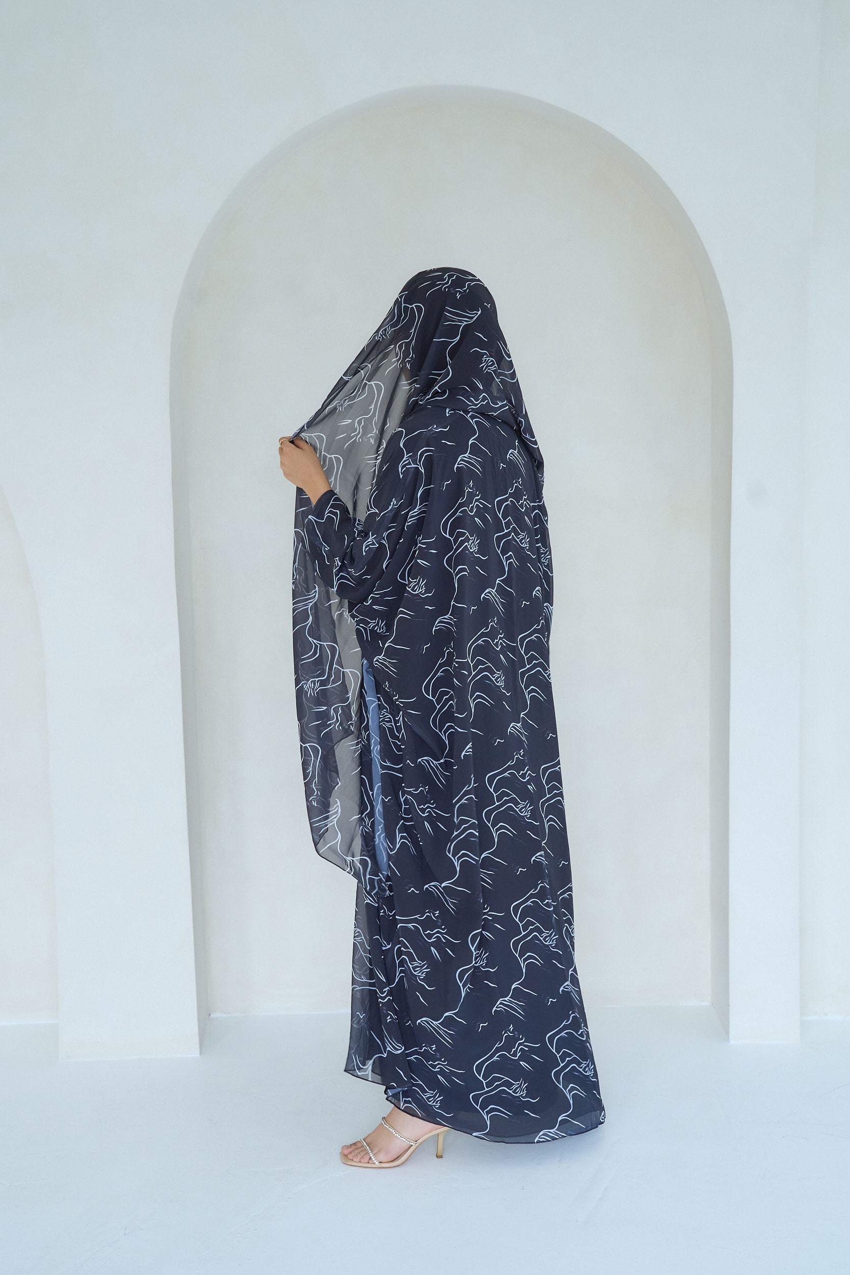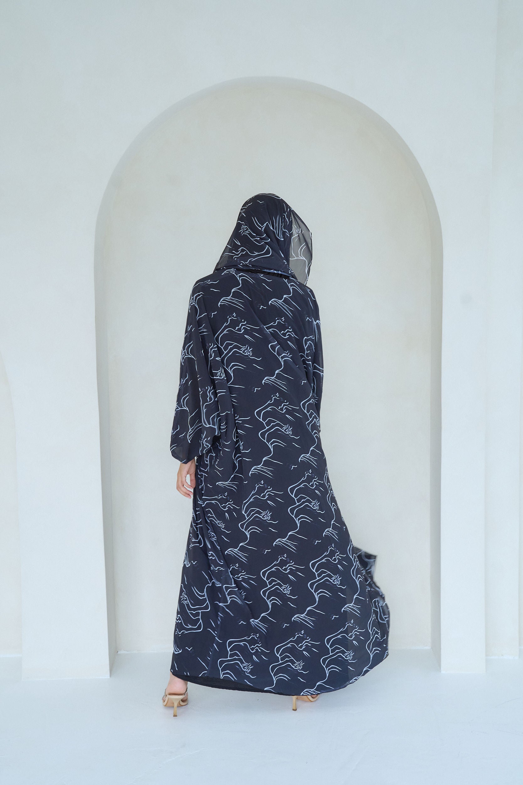 The YOLA abaya embodies elegance with its Bahraini cut styling. Available in black or navy double chiffon fabric with intricate white detailing, this abaya exudes sophistication. It comes with a matching hijab to complete the look.
