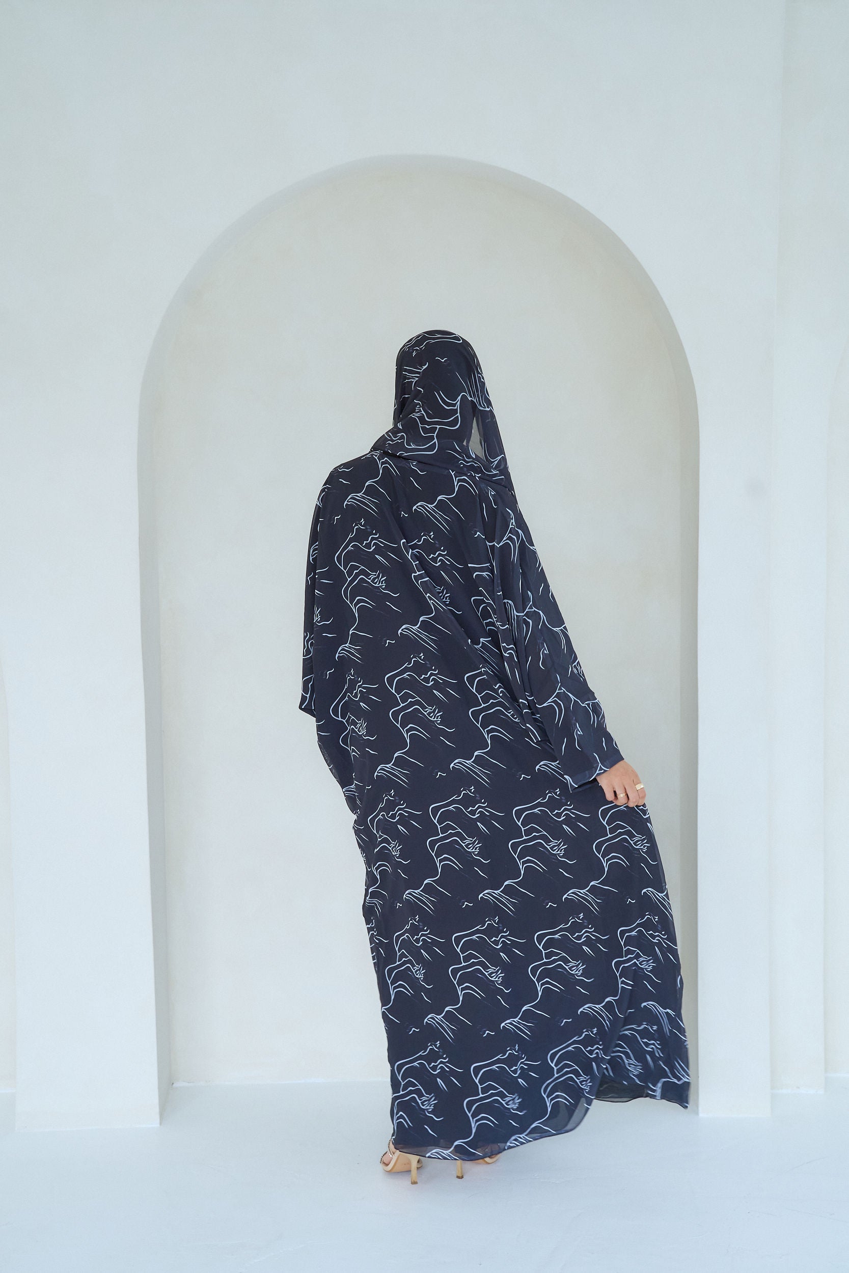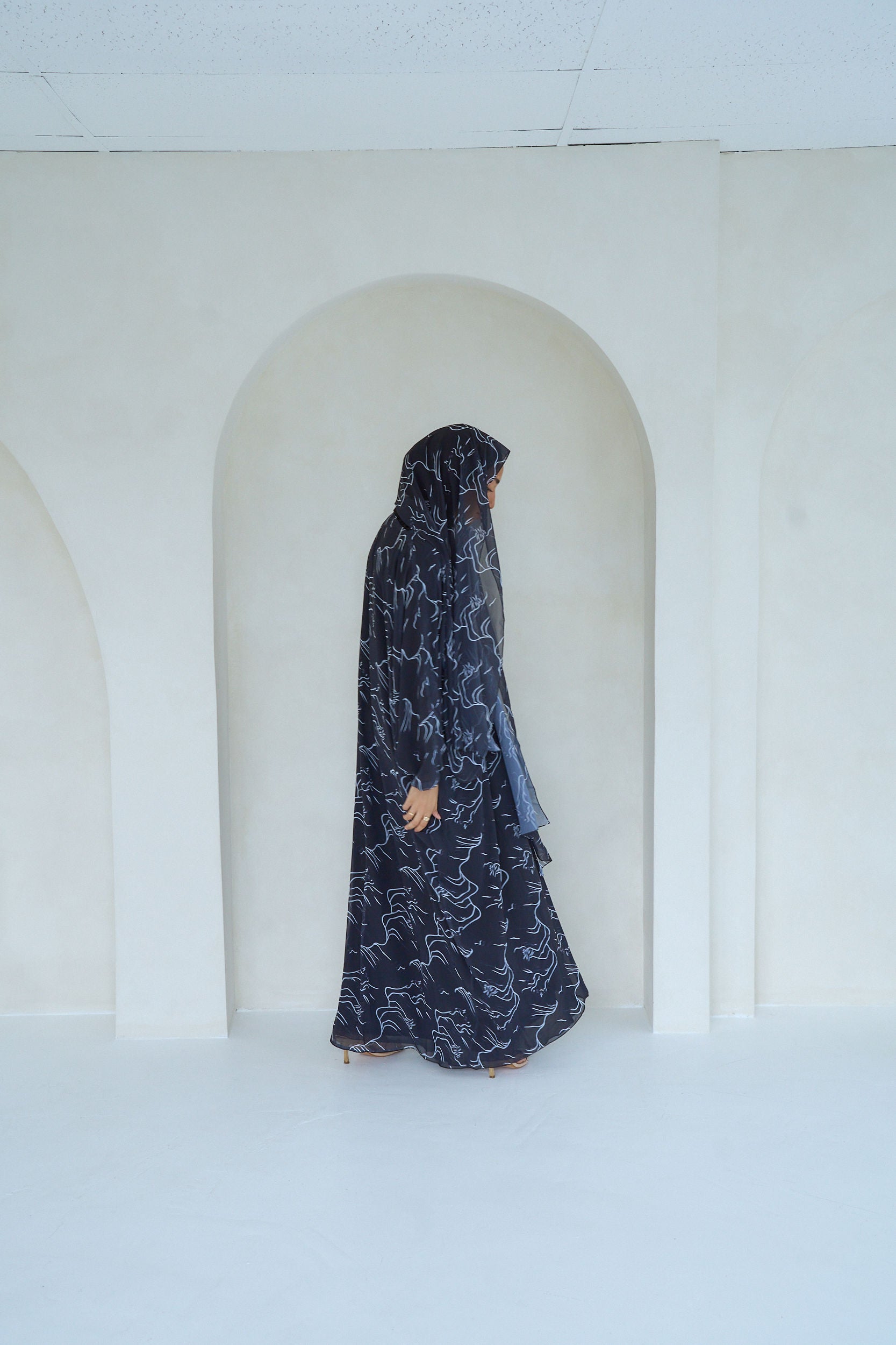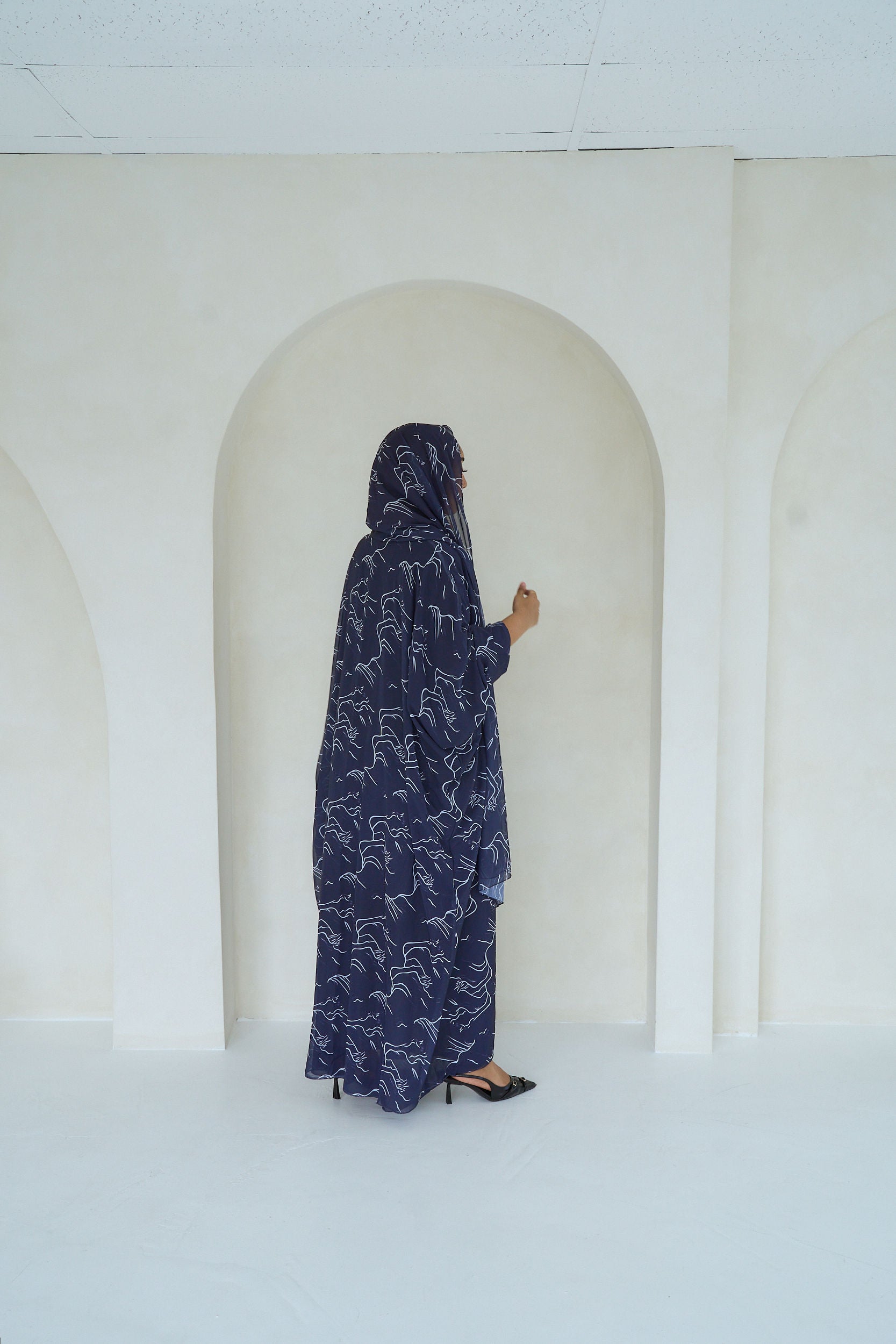 The YOLA abaya embodies elegance with its Bahraini cut styling. Available in black or navy double chiffon fabric with intricate white detailing, this abaya exudes sophistication. It comes with a matching hijab to complete the look.