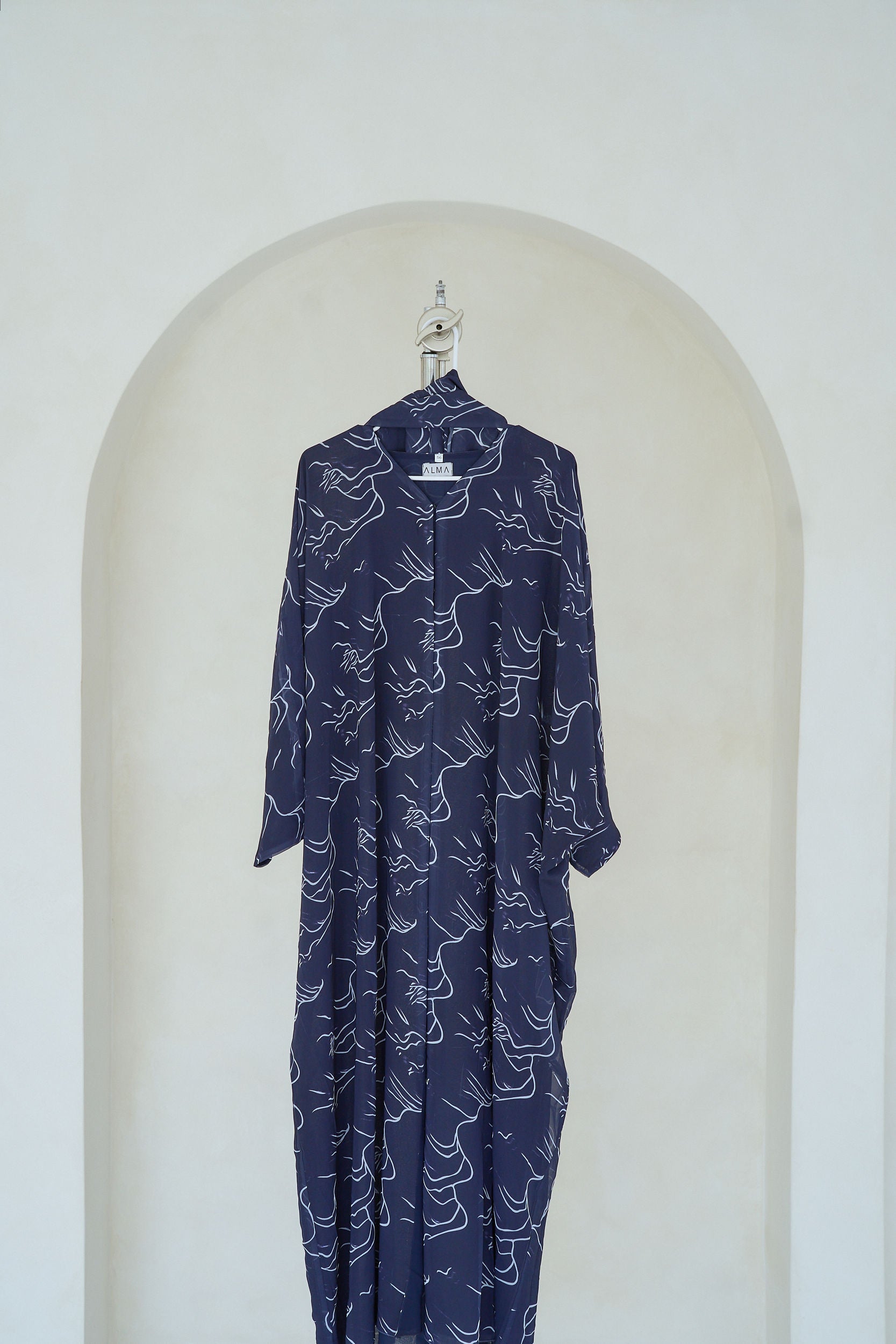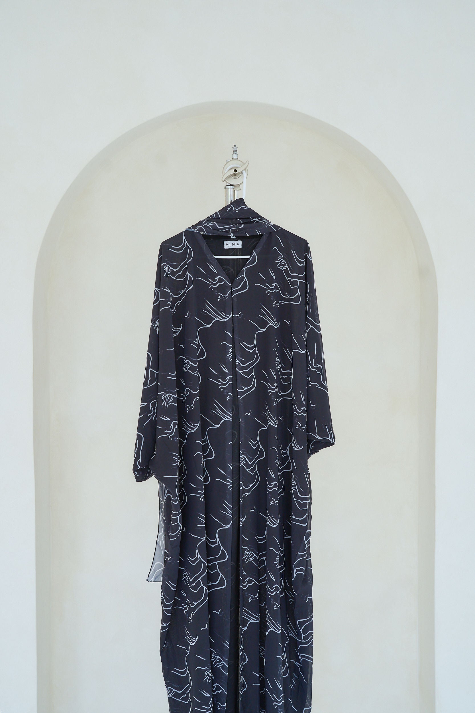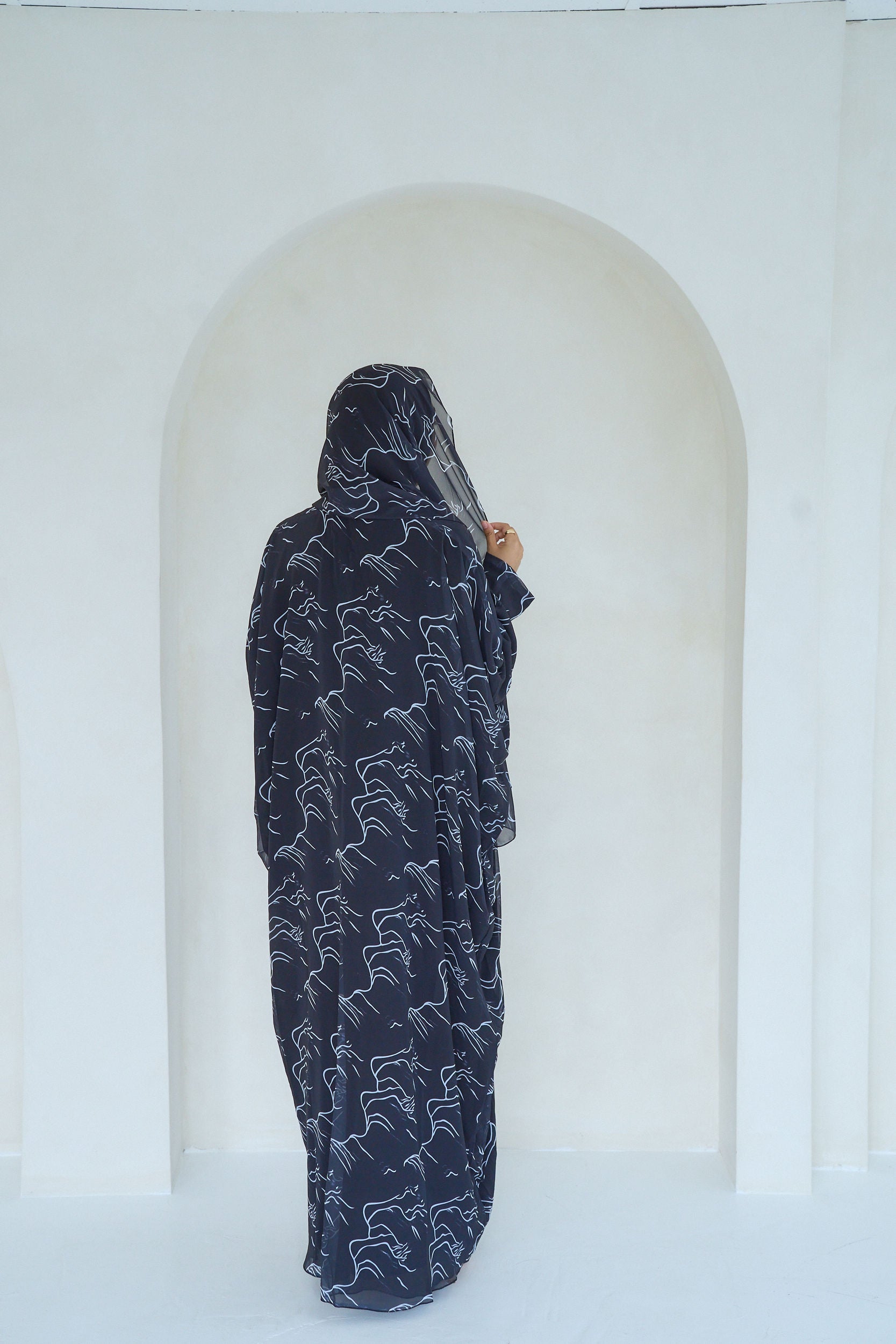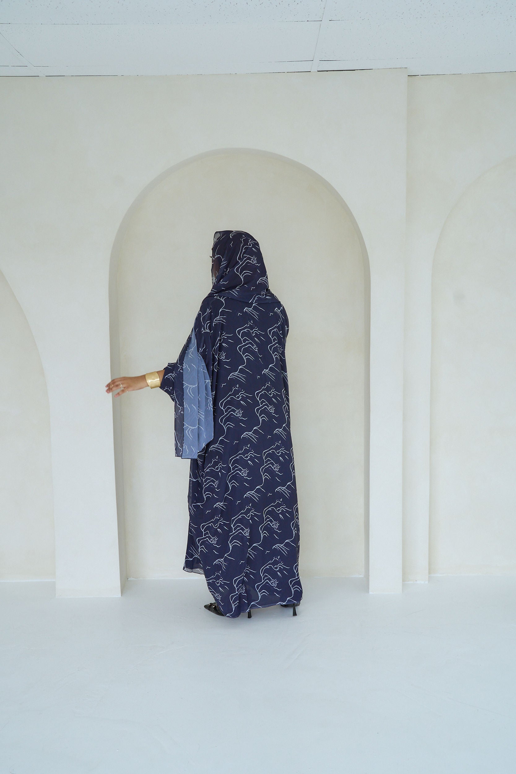 The YOLA abaya embodies elegance with its Bahraini cut styling. Available in black or navy double chiffon fabric with intricate white detailing, this abaya exudes sophistication. It comes with a matching hijab to complete the look.